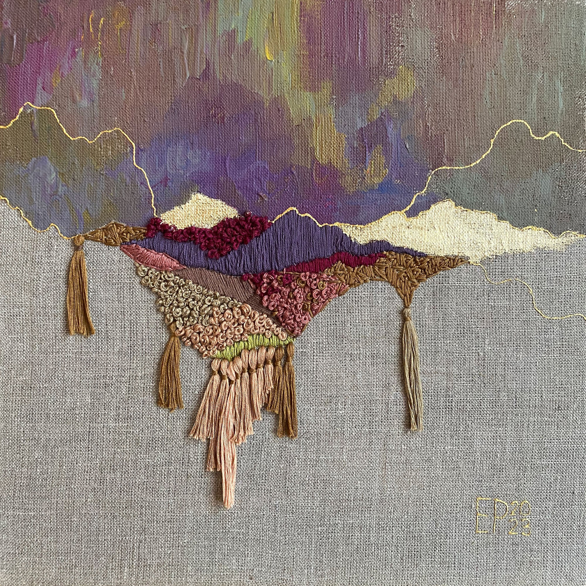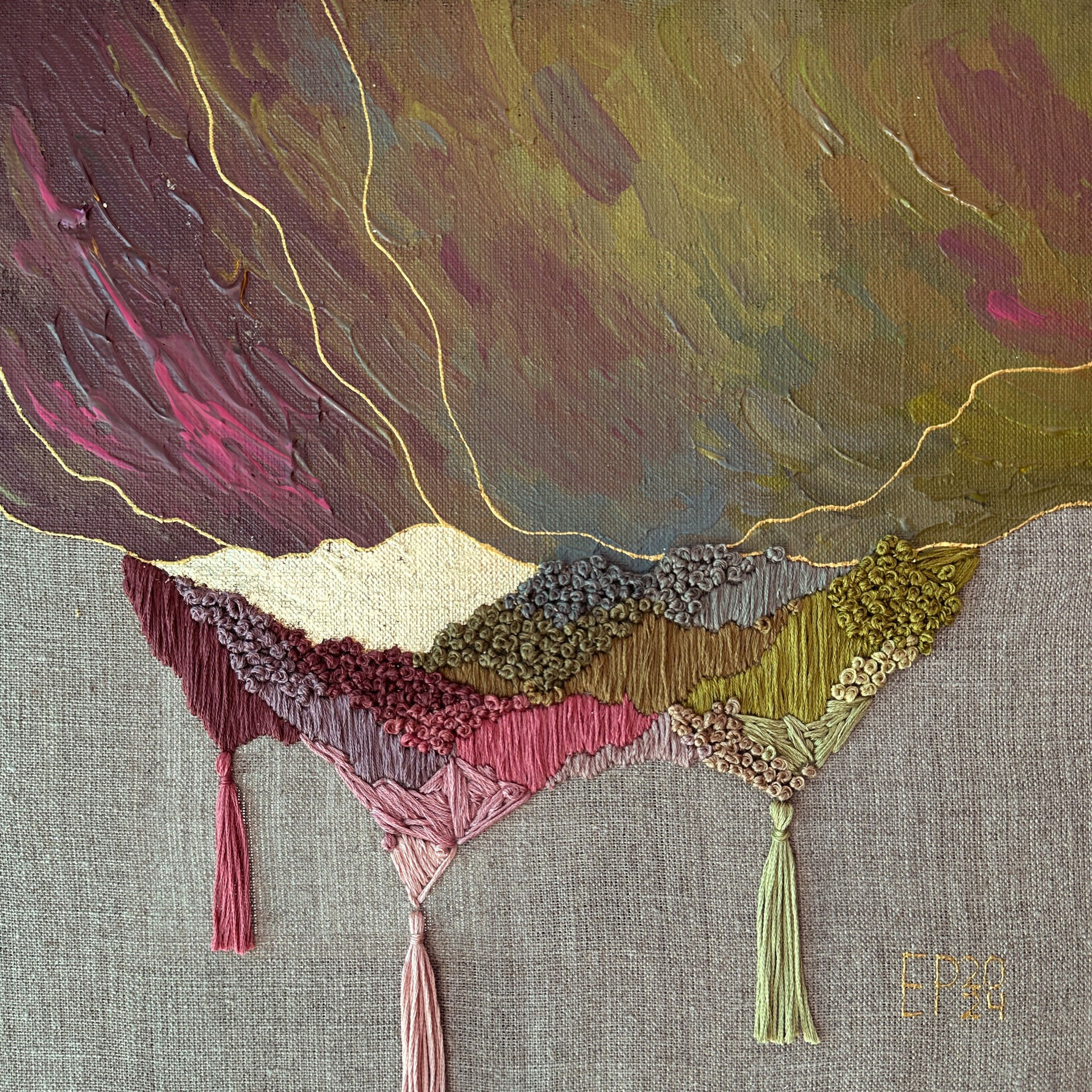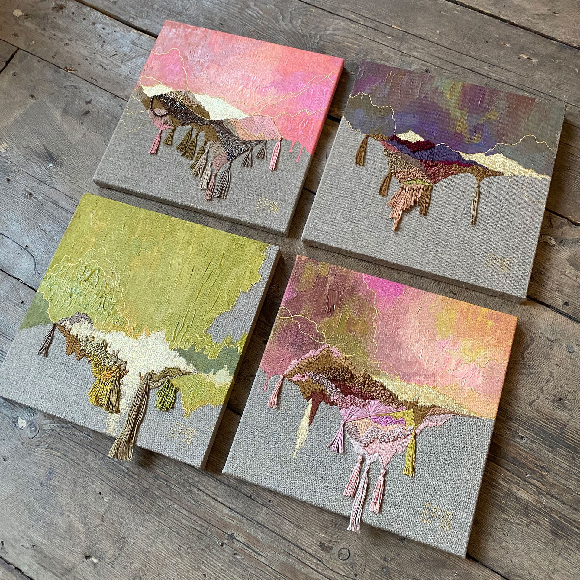 The panels are created using a mixed technique that combines acrylic painting, embroidery, and gold leaf gilding.