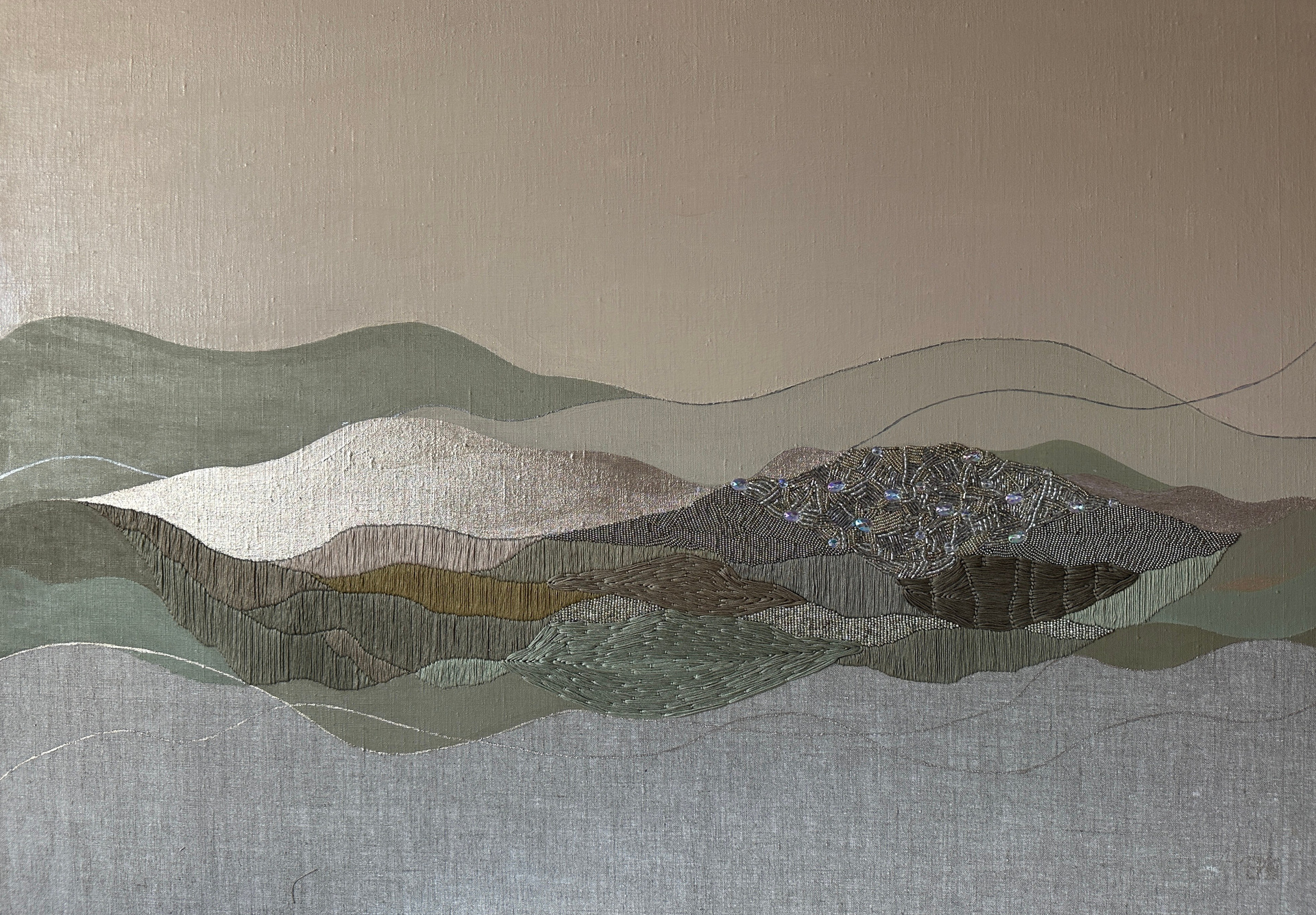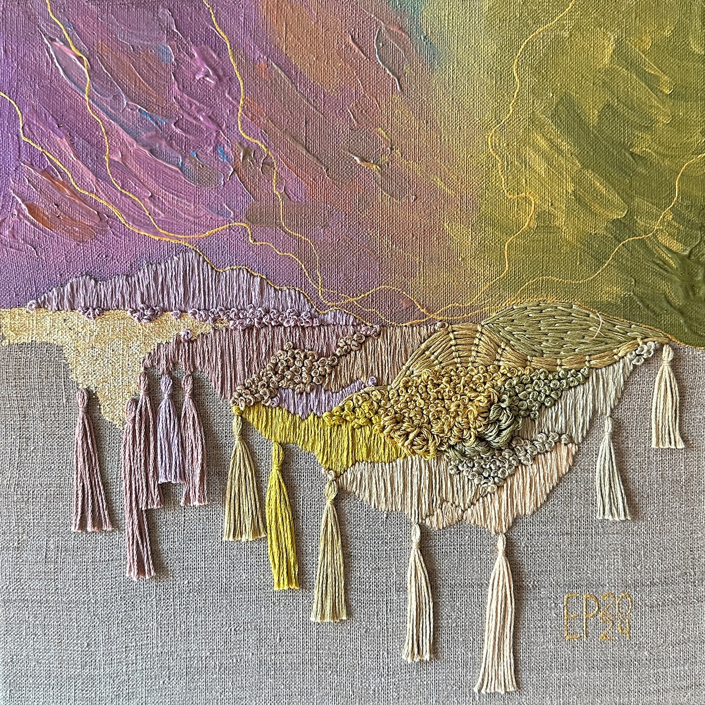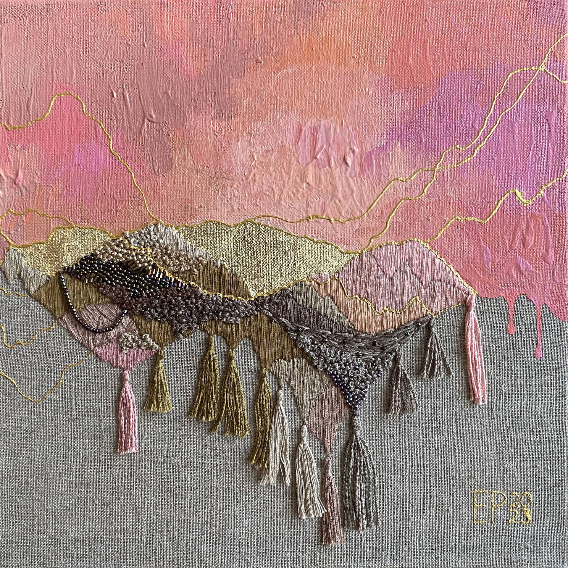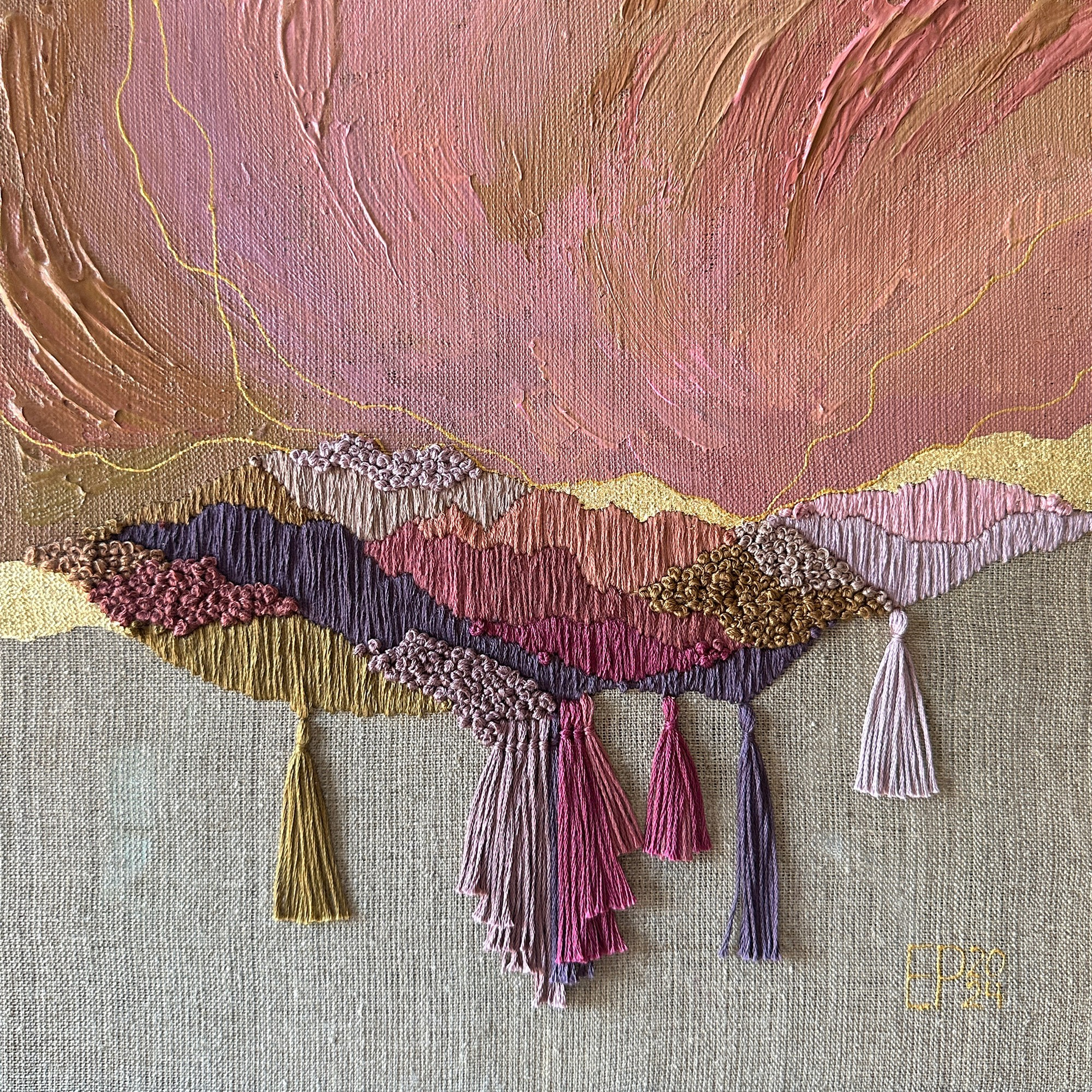The panels are created using a mixed technique that combines acrylic painting, embroidery, and gold leaf gilding.